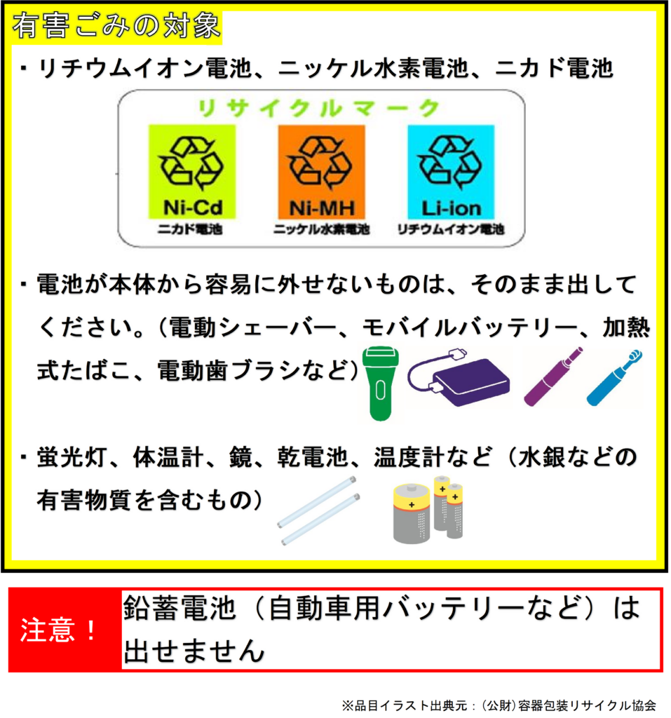 粗大ごみ処理施設に「もやせないごみ」として搬入されたリチウムイオン電池などによる火災が発生しています。事故の未然防止のため。適切な分別にご協力をお願いします。